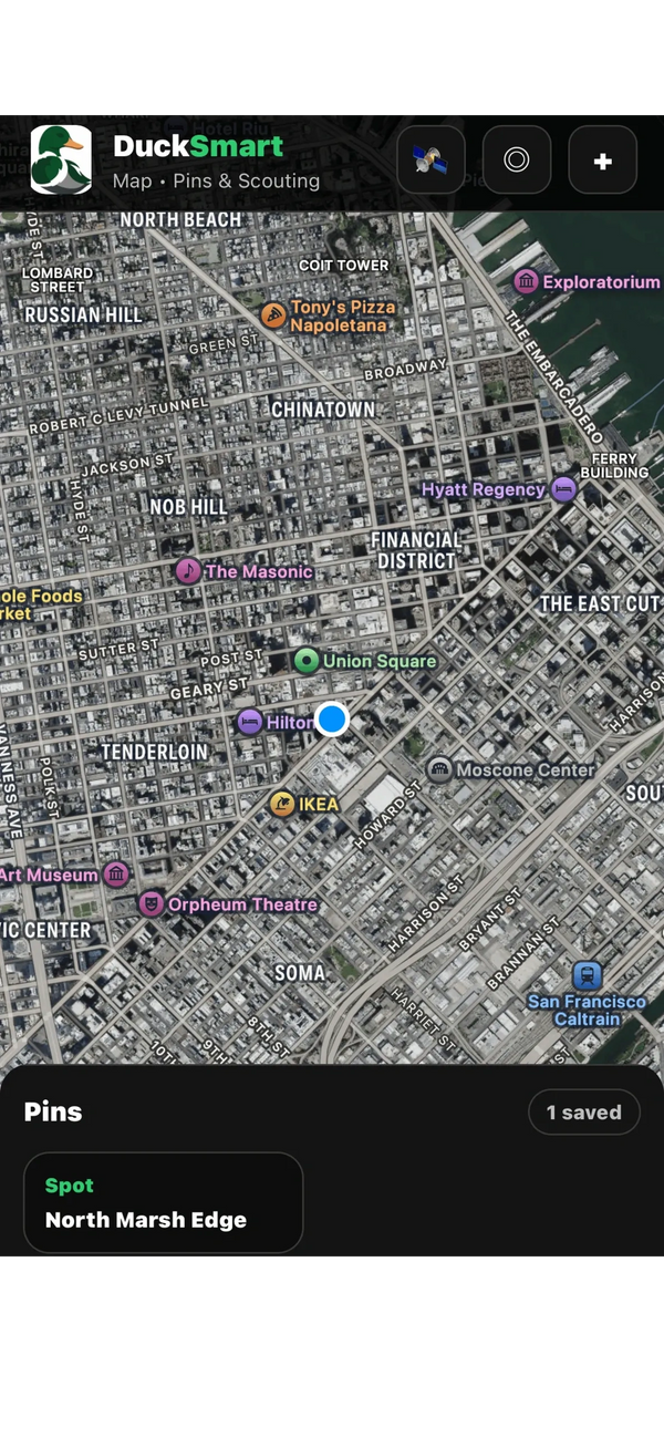 Hunters can use the map to drop pins, mark blinds, and track past hunt locations, making it easier to plan future hunts. The map can also highlight hot zones based on recent hunt logs and conditions, helping users identify areas where bird activity has been strongest. Integrated weather and wind indicators provide additional context so hunters can understand how conditions might influence duck movement in different locations.