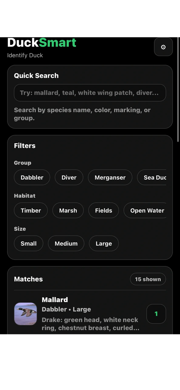 Hunters can browse species by category (dabbling ducks, diving ducks, geese, etc.) or use a simple selection tool where they choose characteristics like body color, head markings, or bill color to narrow down possible matches. Each species profile includes photos, identifying traits, and typical habitat information, making it easy to confirm what bird they’re seeing.
