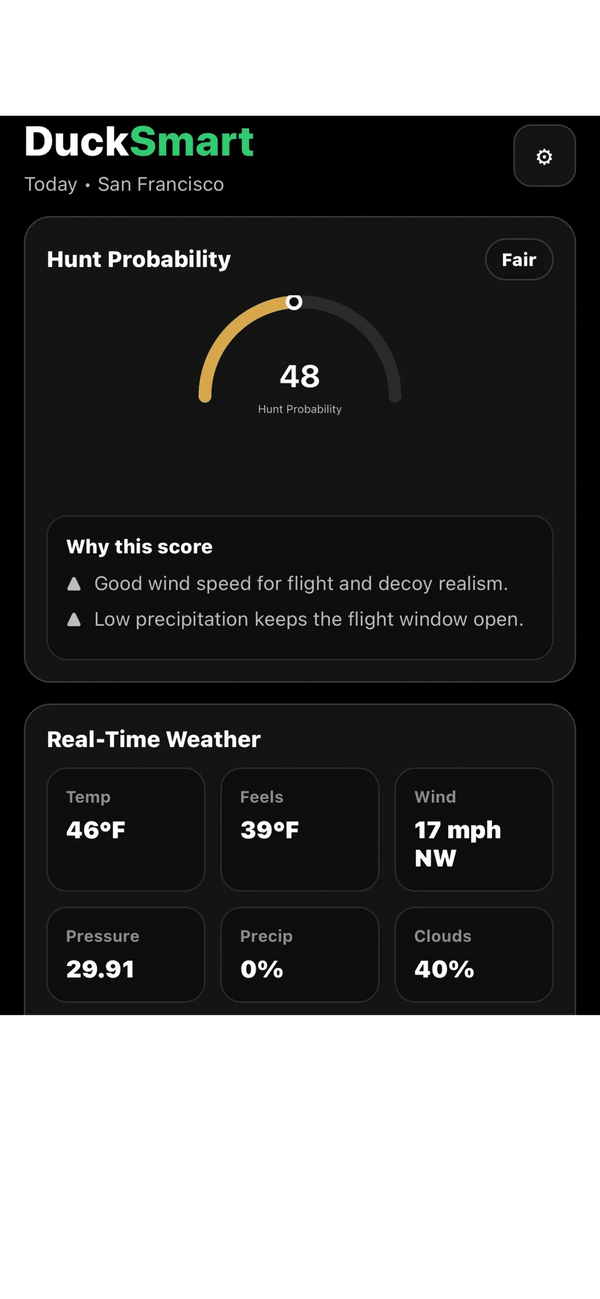 DuckSmart is a waterfowl hunting app designed to help hunters make smarter decisions about when and where to hunt. It analyzes weather patterns, environmental conditions, and hunting data to generate a daily duck flight prediction, helping users identify the best times for bird movement.